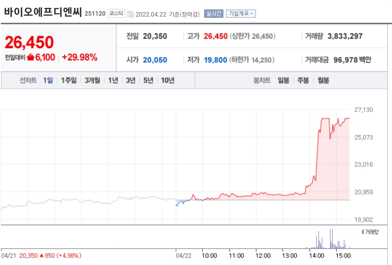 해당 글은 당일 종가기준 15%이상의 상승을 보여준 종목들 중에서 선정하여 주가 급등의 이유를 간단히 파악합니다. 매수 추천글은 아니며 어떠한 사유로 바이오에프디엔씨의 주가가 급등을 하였는지를 파악해보고 이러한 종목들을 매일 정리하여 앞으로 다가올 급등주를 예측할 수 있는 안목을 기르는데 그 목적이 있습니다.