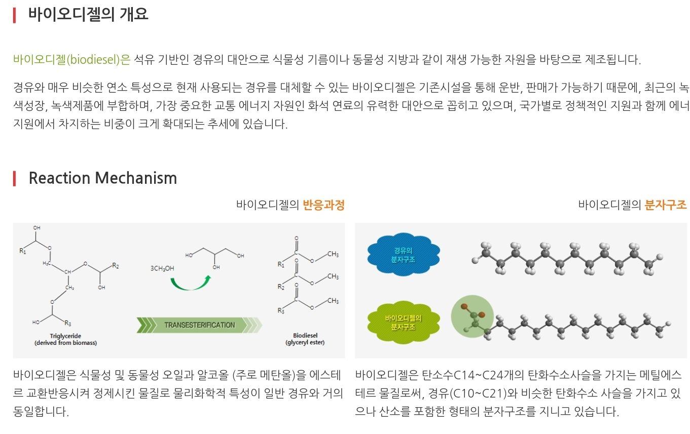 바이오디젤은 2008년 1월 국내 정유사 품질규격에 적합한 제품을 출시한 이래 정유사에 바이오디젤(BD100)을 안정적으로 공급하고 있고, 수송용 경유에 대한 의무혼합비율 상승과 함께 판매량이 꾸준히 증가하고 있습니다. 또한, Global 수요처의 품질기준을 만족시킬 수 있는 고품질의 바이오디젤 생산 역량을 바탕으로 적극적인 수출시장 개척을 진행하고 있습니다.