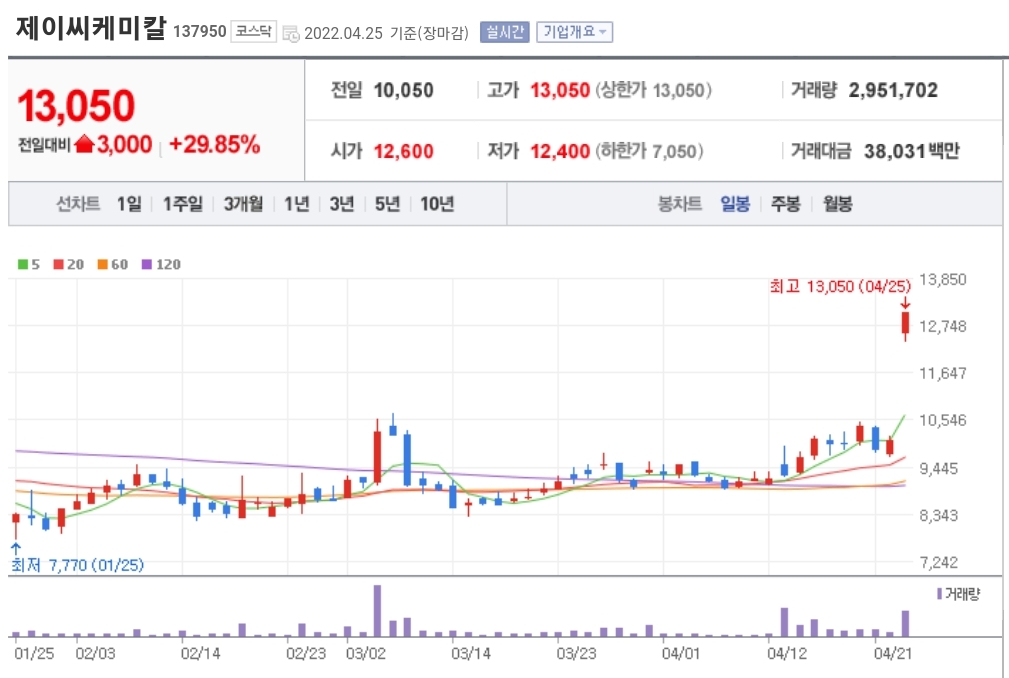 해당 글은 당일 종가기준 15%이상의 상승을 보여준 종목들 중에서 선정하여 주가 급등의 이유를 간단히 파악합니다. 매수 추천글은 아니며 어떠한 사유로 제이씨케미칼의 주가가 급등을 하였는지를 파악해보고 이러한 종목들을 매일 정리하여 앞으로 다가올 급등주를 예측할 수 있는 안목을 기르는데 그 목적이 있습니다.