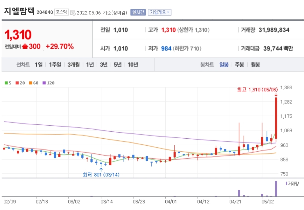 해당 글은 당일 종가기준 15%이상의 상승을 보여준 종목들 중에서 선정하여 주가 급등의 이유를 간단히 파악합니다. 매수 추천글은 아니며 어떠한 사유로 지엘팜텍의 주가가 급등을 하였는지를 파악해보고 이러한 종목들을 매일 정리하여 앞으로 다가올 급등주를 예측할 수 있는 안목을 기르는데 그 목적이 있습니다.