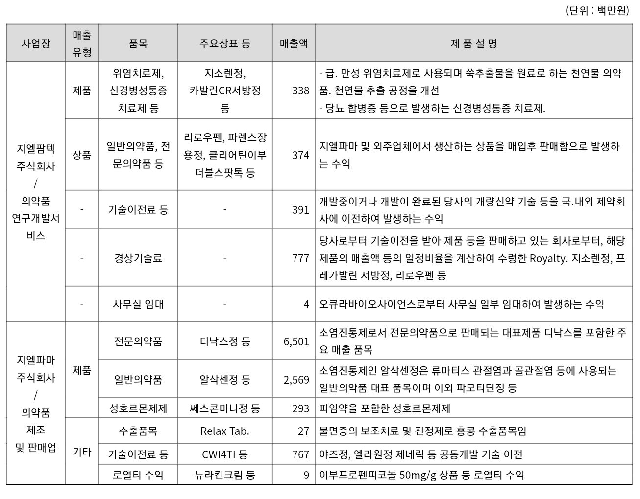 종속회사인 지엘파마 (구.크라운제약)는 KGMP 시설을 보유한 회사로 의약품의 제조 및 판매업(양약)을 주요 사업분야로 하고 있습니다.