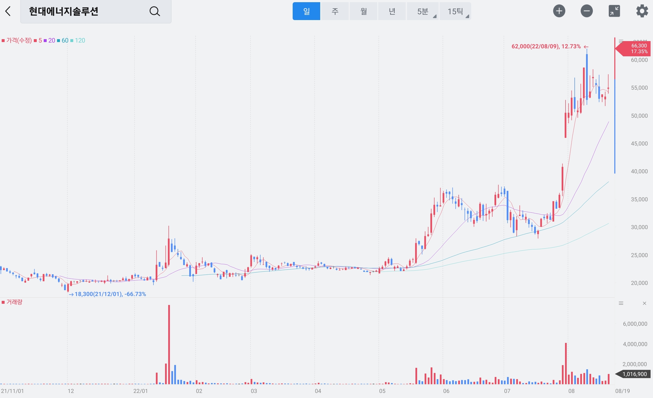 해당 글은 당일 종가기준 15%이상의 상승을 보여준 종목들 중에서 선정하여 주가 급등의 이유를 간단히 파악합니다. 매수 추천글은 아니며 어떠한 사유로 현대에너지솔루션의 주가가 급등을 하였는지를 파악해보고 이러한 종목들을 매일 정리하여 앞으로 다가올 급등주를 예측할 수 있는 안목을 기르는데 그 목적이 있습니다.