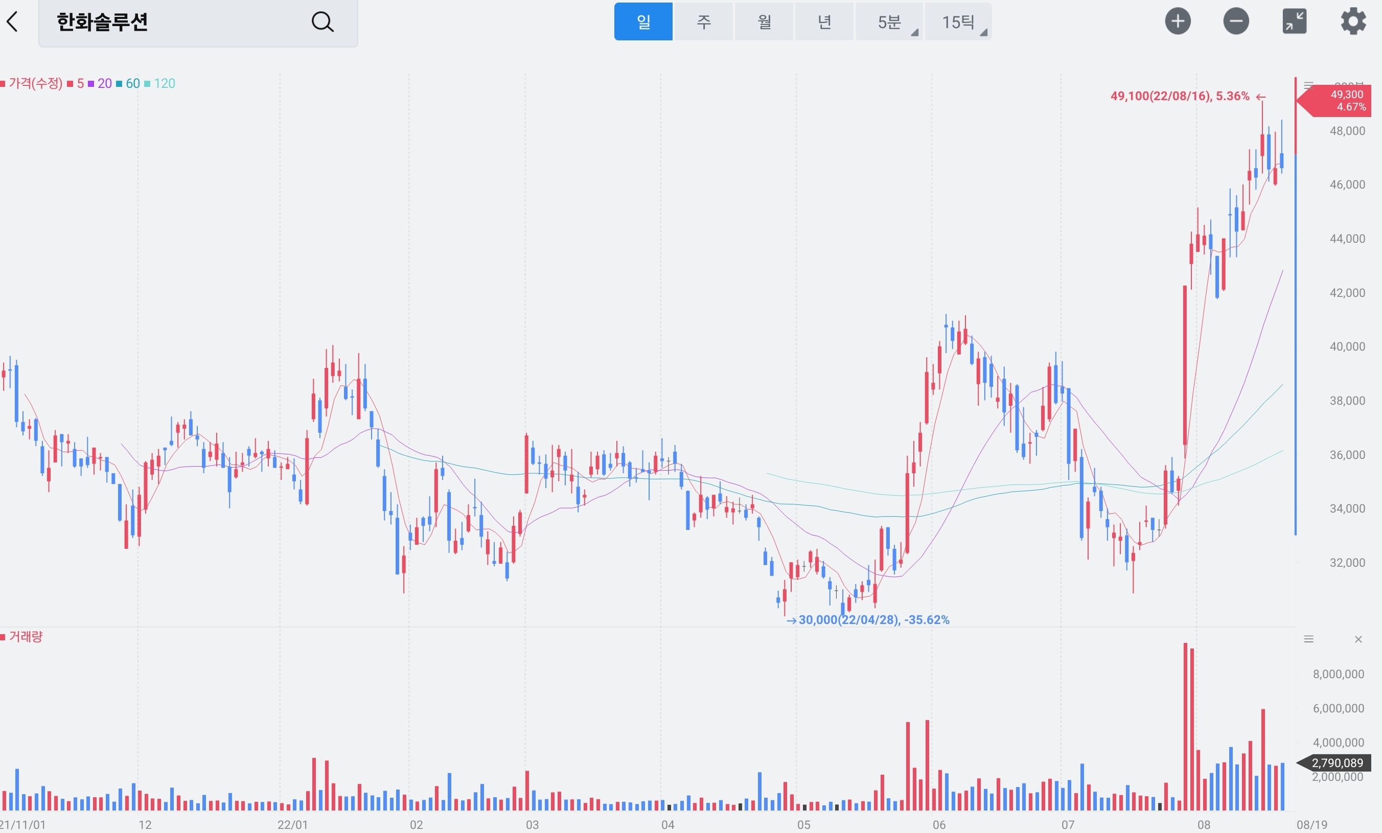 이에 더해 한화솔루션의 2022년 8월 24일 종가기준 시가총액은 9조 4천억이고 현대에너지솔루션의 시가총액은 7,400억인 것도 현대에너지솔루션의 상승이 더 가팔랐던 것에 한몫했습니다.