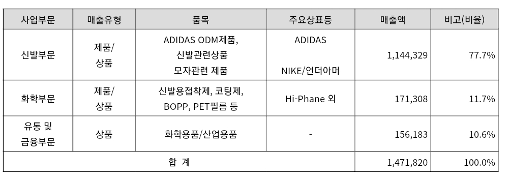 신발부문의 ODM신발 가격은 아디다스와의 ODM 계약에 따라 상호간 협의된 가격으로 판매하고 있습니다. 화학사업의 경우, 국제유가 및 환율 등 매입원가를 반영하여 판매단가를 적용하고 있으며, 국제유가 및 환율 등 시장 상황에 따라 가격 변동이 발생하고 있습니다.