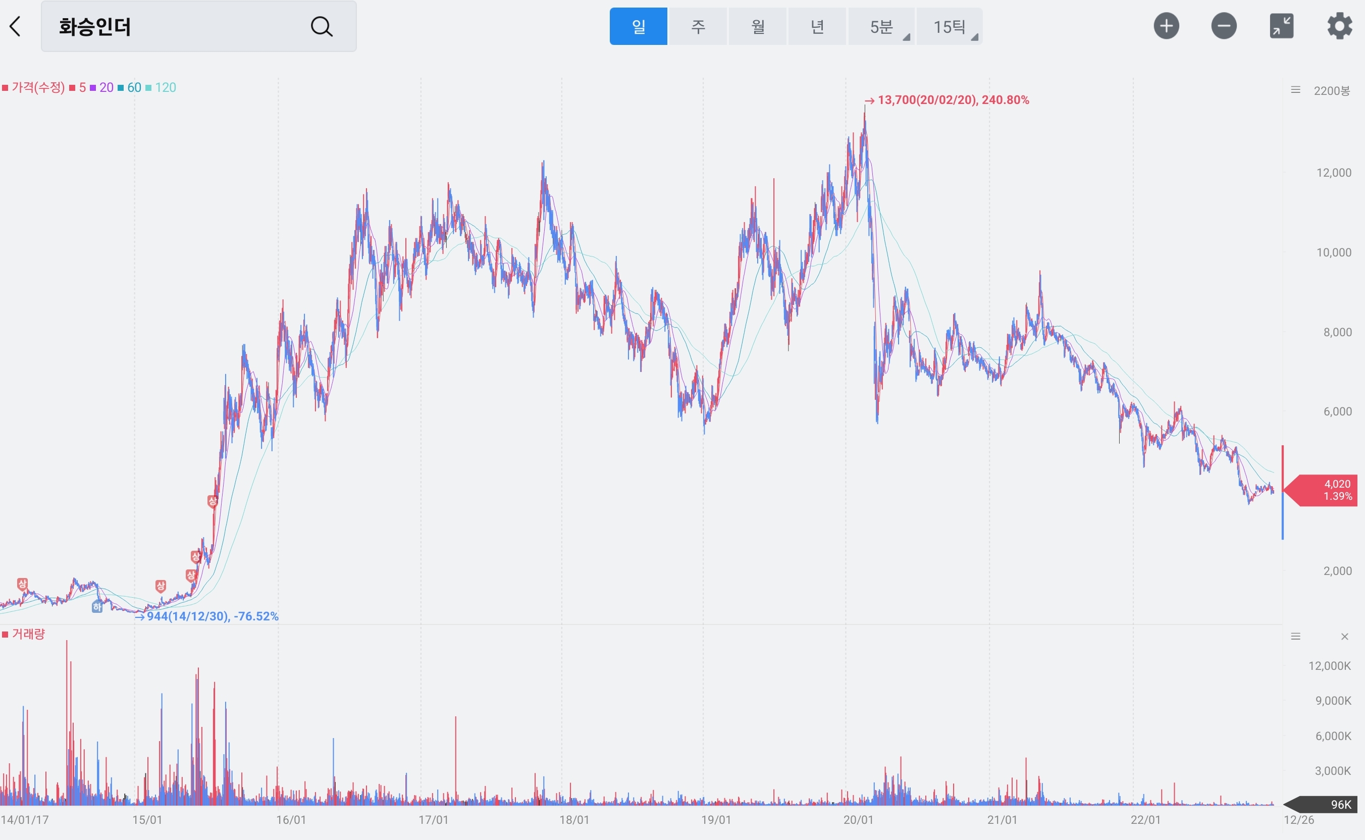 화승인더의 주가는 최고점대비 약 70%하락한 상황이며 화승인더의 매출 창출 능력을 고려해봤을 떄 현재의 주가는 지나지게 하락한 것으로 보입니다.