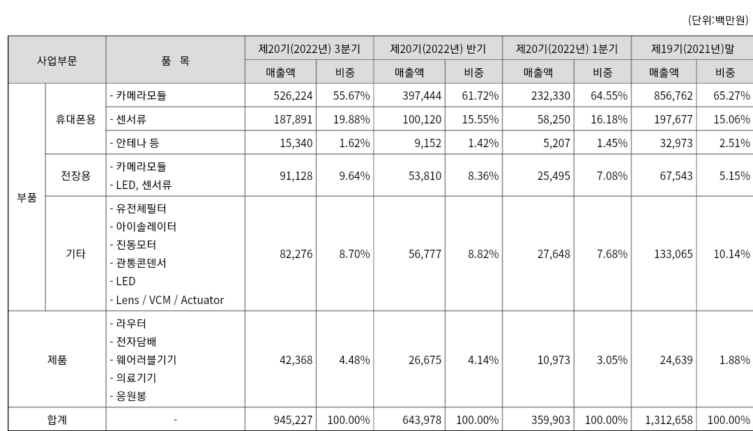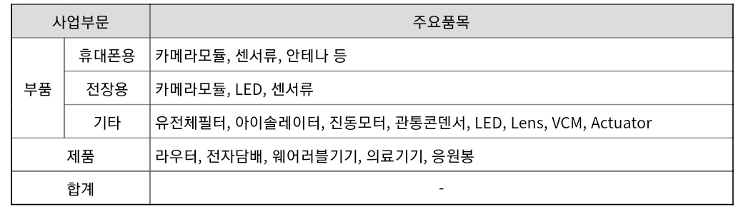 또한, 지난 몇 년간 미래 성장 동력을 확보하기 위해 자동차용 부품(카메라 모듈, 스마트 헤드라이트용 LED, 지문센서, TMS), 5G용 무선 기기(라우터), 각종 센서 모듈(심박, 온도, 지문인식, 홍채인식, TOF모듈 등) 사업의 다양화 및 고도화, 웨어러블 기기(스마트 워치, 무선 헤드셋, 체온계 등) 등 신사업을 시작했습니다.