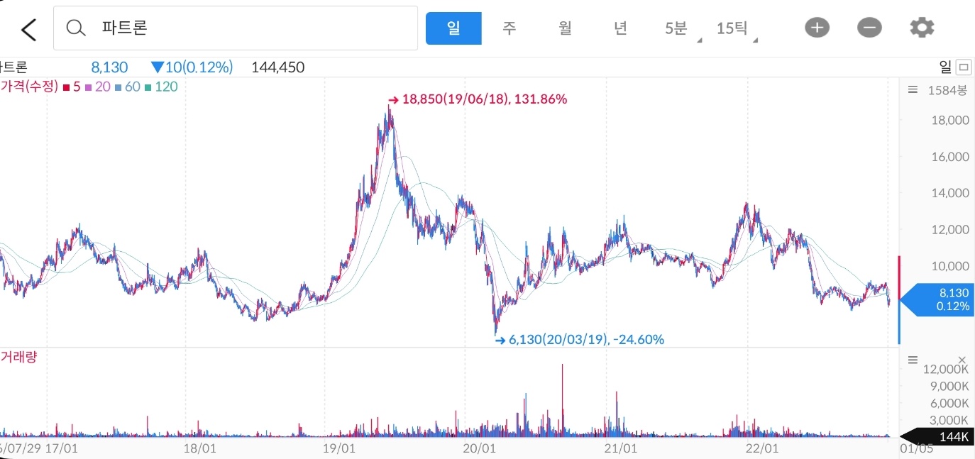 지난 5년간의 주가흐름을 본다면 현재 매출수준에서 파트론의 적정주가는 9,000원 정도이며 현재는 경기침체에 대한 우려로 적정주가보다 10%정도 빠진 수준이라는 것이 개인적인 의견입니다.