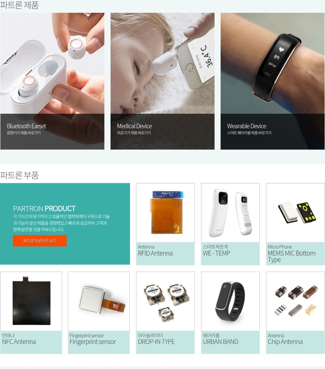 파트론의 사업부문은 부품( 휴대폰용, 전장용, 기타)과 제품(웨어러블기기, 의료기기, 전자담배 등)으로 구분할 수 있습니다.
