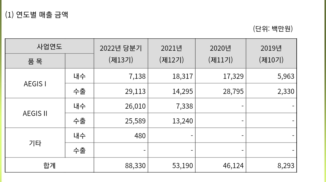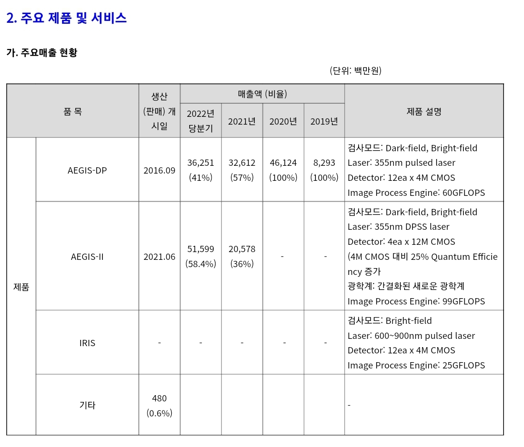 올해 반도체 경기가 안좋았다고는하지만 위의 2022년 3분기기준 실적에서 알 수 있듯 넥스틴의 3분기 기준실적은 이미 작년 1년 동안의 실적을 넘어섰습니다. 또한 2021년 출시한 이지스(AEGIS II)의 매출도 가파르게 상승하고 있습니다.