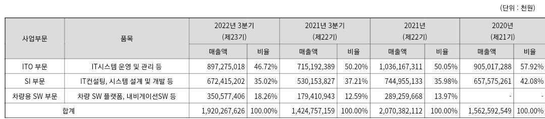 위의 매출비중에서 알 수 있다시피 현대오토에버의 매출액은 세가지 사업분야에서 고르게 발생하고 있는 것을 알 수 있습니다.
