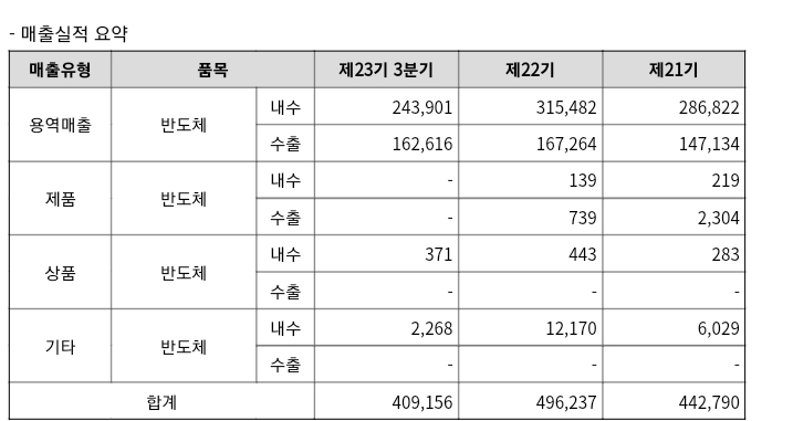 엘비세미콘은 반도체 후공정관련 Bump, Test, Back-End 등 단일사업부문으로 구성되어 있으며, 매출실적은 아래와 같습니다.