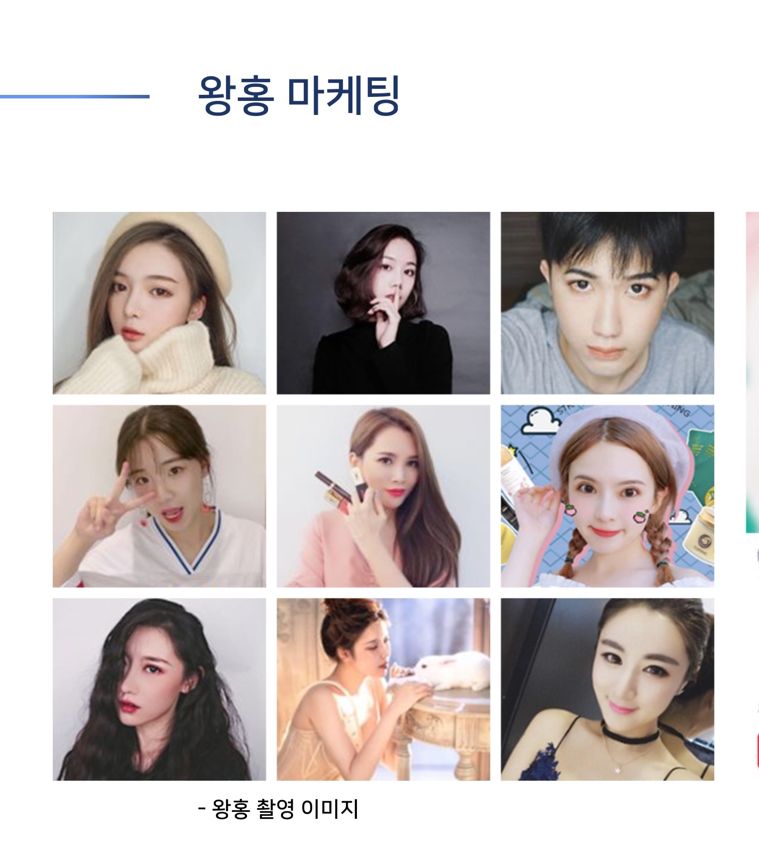 청담글로벌은 중국의 왕홍회사들과 전략적 관계를 구축하여 약 350여 명의 왕홍들을 협력하고 있으며, 왕홍들을 한국에 초대하여 판매 대회 등의 이벤트 행사 또한 개최하고 있습니다.