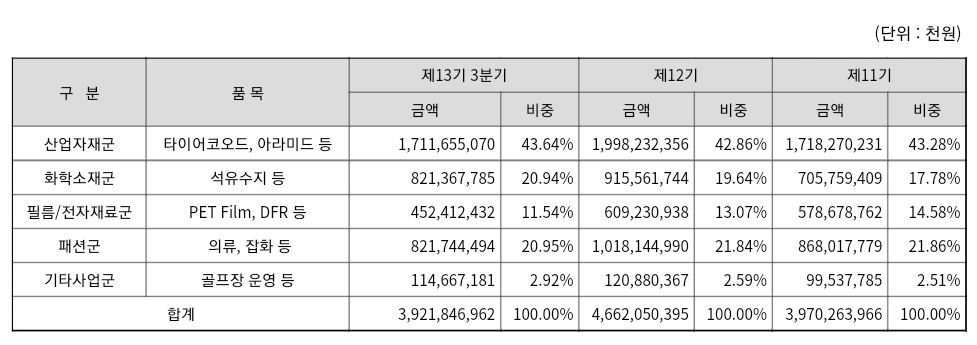 산업자재는 방탄, 내열에 쓰이는 아라미드부터 에어백, 안전벨트용 원사 등 다양한 제품군을 생산중입니다.
