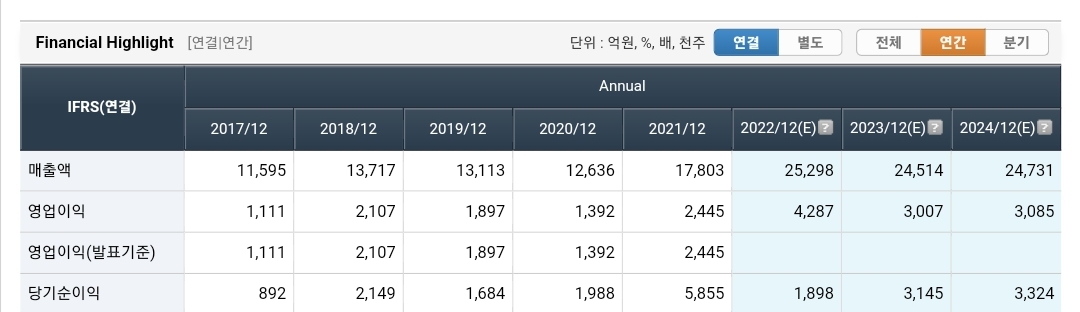 롯데정밀화학의 실적은 2017년 이후 비슷한 수준을 계속 지속해오다가 2021년에 크게 상승하였습니다. 앞으로는 완만한 매출성장을 이어갈 것으로 보이며 롯데화학계열 회사중에서 알짜 회사인 롯데정밀화학은 양호한 실적은 계속 낼 것으로 기대됩니다.