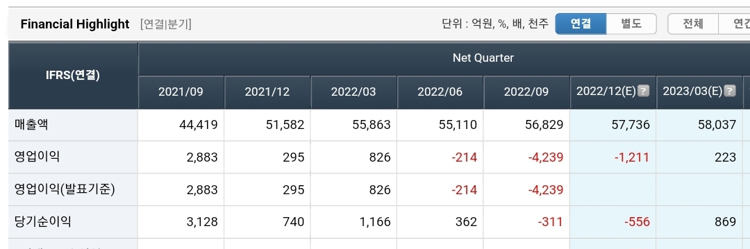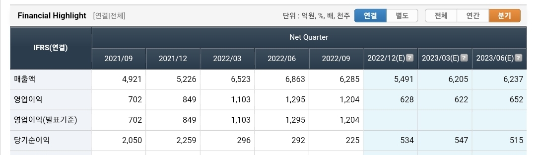 아래 2020년 매출액부터 확인할 수 있듯이 2022년 3분기까지 매출액이 2021년 1년 동안 발생한 매출액과 비슷한 수준인 것을 알 수 있습니다. 하지만 이는 2022년에 사업환경이 더 좋았다기 보다는 원재료 상승으로 인해 그 상승분을 판가에 전가하면서 발생한 현상으로 당기순이익이나 영업이익의 증가로 이어지진 못했습니다.