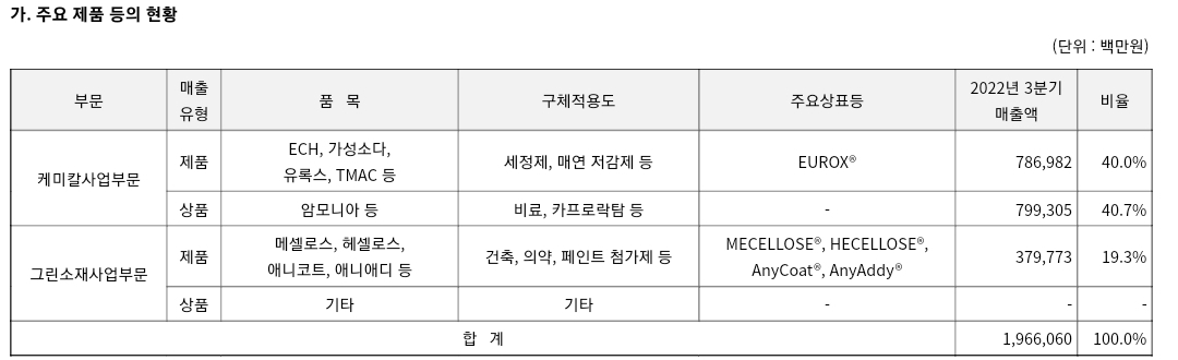 그린소재사업부는 셀룰로스계열 제품으로 구성되어 있으며 글로벌 경쟁우위에 있는 고부가 제품을 생산하고 있으며, 증설을 통하여 지속 성장하고 있습니다.