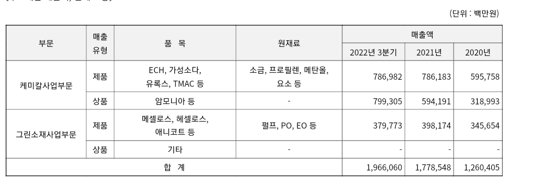 케미칼사업부는 염소 계열과 암모니아 계열로 분류되며 ECH, 가성소다, 암모니아, 유록스 등 다양한 제ㆍ상품을 판매하고 있습니다.
