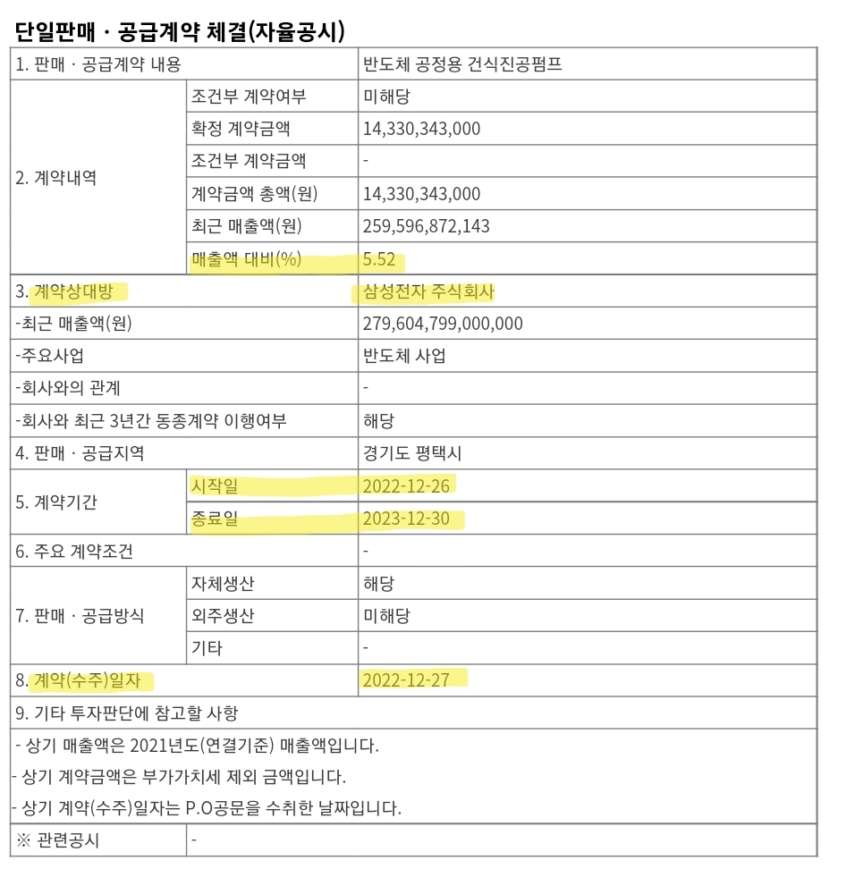 엘오티베큠은 2022년 12월 27일 삼성전자와의 공급계약을 전자공시시스템에 공시하였습니다. 반도체 공정용 건식진공펌프 판매계약으로 직전연도 매출액이 5.52%에 해당하는 규모입니다.