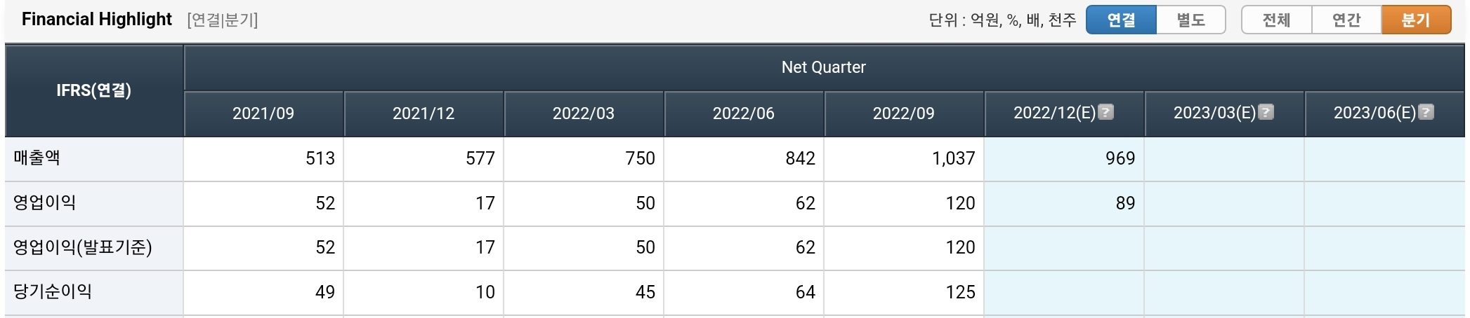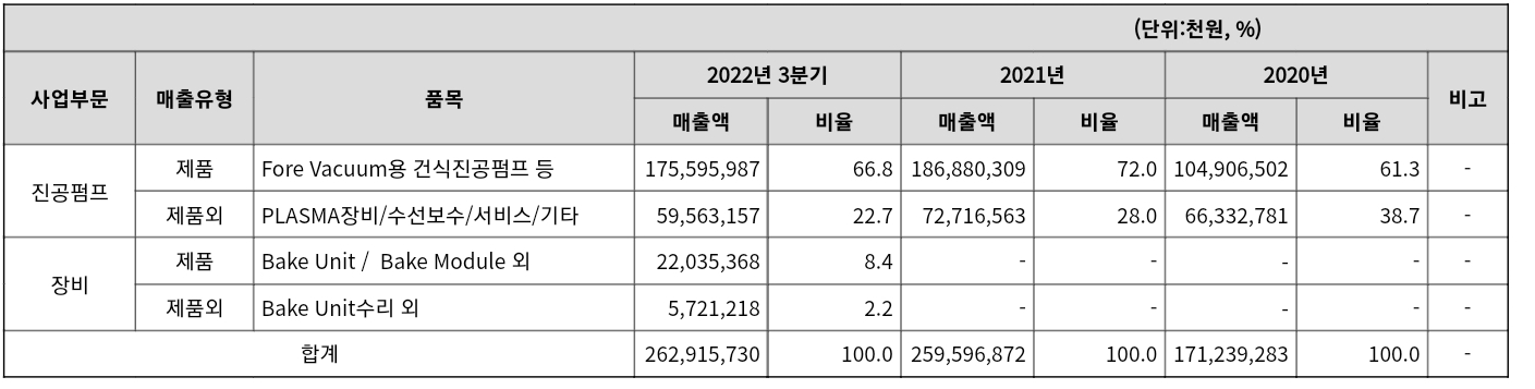 위의 2022년 사업보고서에서 알 수 있다시피 대부분의 매출이 진공펌프 제조와 그에 대한 A/S에서 발생하고 있는 것을 알 수 있으며 2022년 3분기까지 매출이 이미 2021년 한해 매출을 초과한 것을 알 수 있습니다.