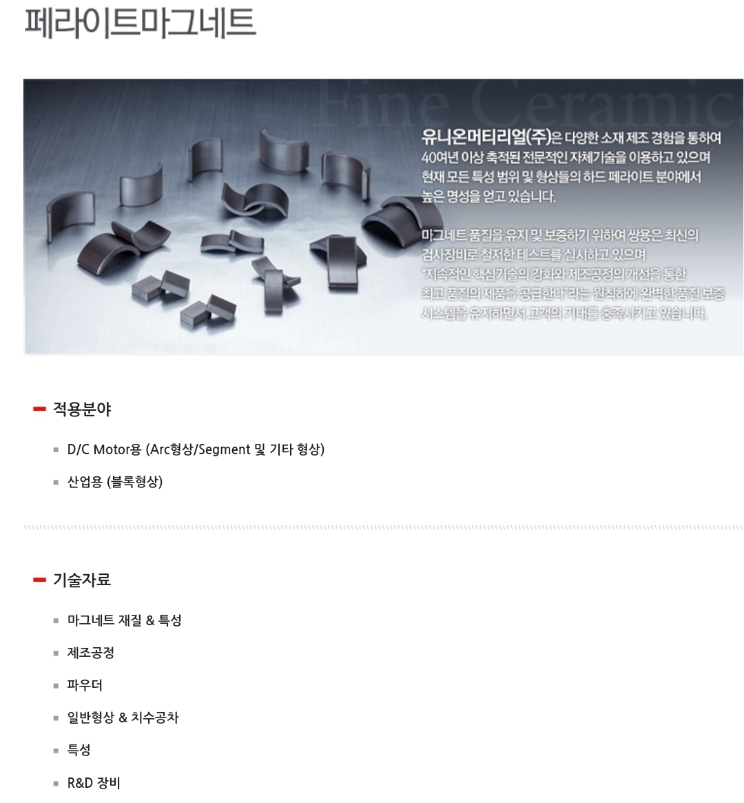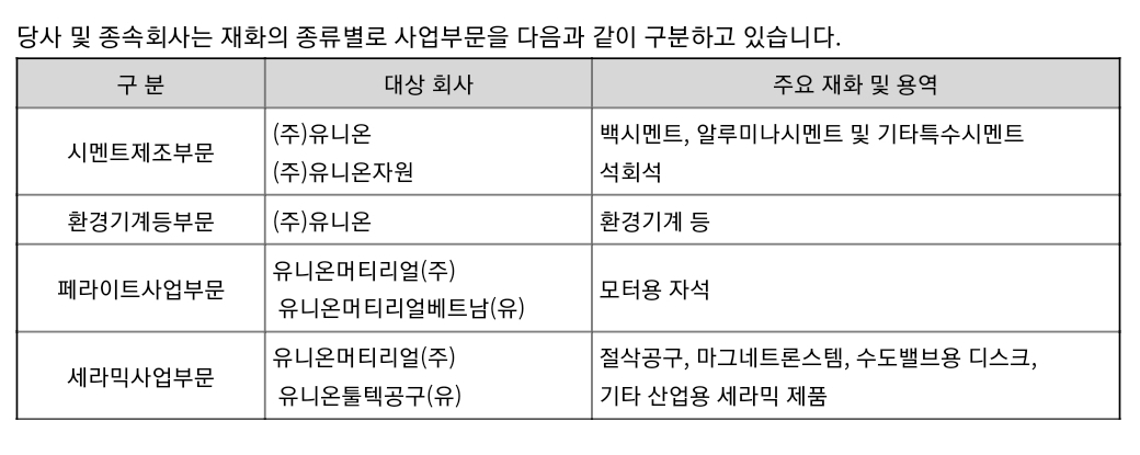연결대상 종속회사인 유니온머티리얼(주)는 파인세라믹 중 자기적 기능을 이용한 페라이트 마그네트, 기계구조적 기능을 이용한 절삭공구, 절연성 및 내열성을 이용한 전자레인지용 Magnetron Stem, 내마모성을 이용한 수도밸브용 Disc 등 세라믹의 고유한 기능을 망라하는 부품소재사업을 영위하고 있습니다.