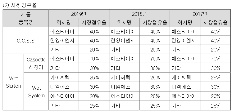 에스티아이는 한양이엔지와 함께 CCSS 중앙화학약품공급장치가 주력인 회사입니다. 한양이엔지와 동일한 40%의 점유율을 확보하고 있으며 반도체 설비투자가 이뤄질 때 매출이 증가하는 특징을 가지고 있습니다. CCSS가 전체 매출의 90%를 차지하고 있기때문에 수주가 얼마만큼 예정되어있는지가 중요합니다, 또힌 우리나라 최대 반도체 기업인 삼성전자향 매출이 전체 매출의 60%이상을 차지하고 있습니다.