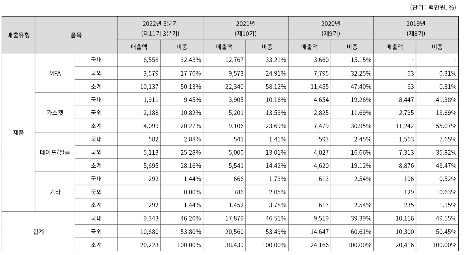 아이씨에이치 전체 매출액의 절반 정도는 MFA에서 발생하고 있으며 가스켓과 테이프/필름은 나머지 매출 비중을 양분하고 있습니다.
