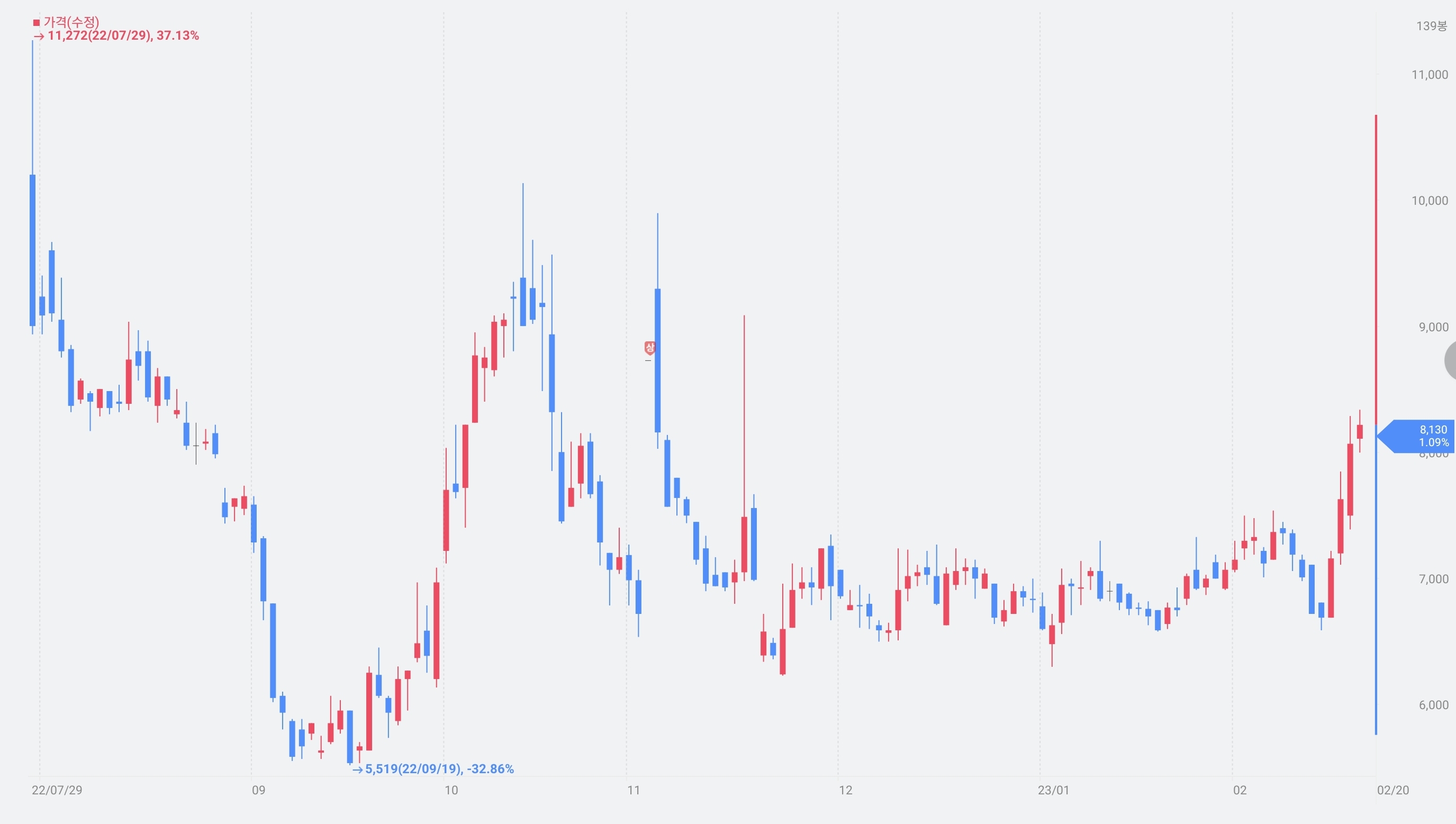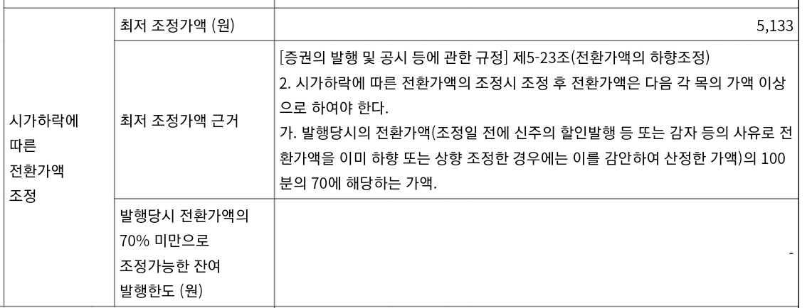전환가액은 7,332원이며 2023년 2월 21일 종가(8,130)와 비교했을 떄 약 10%정도 낮은 수준입니다. 주가 하락시 리픽싱 조건도 있으며 리핑싱 최저가는 5,133원입니다.