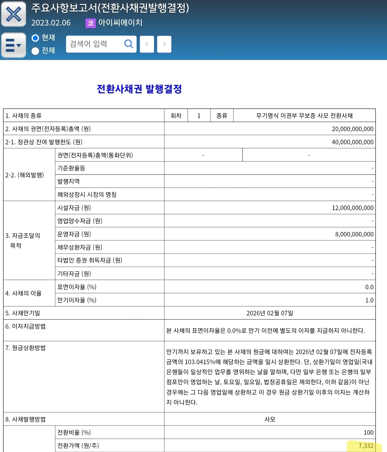아이씨에이치는 200억원 규모의 전환사채(CB)를 발행키로 결정했다고 3일 밝혔습니다. 납입일은 2월 7일, 사채만기는 2026년 2월 7일이며 표면금리는 0%, 만기금리는 1%입니다.