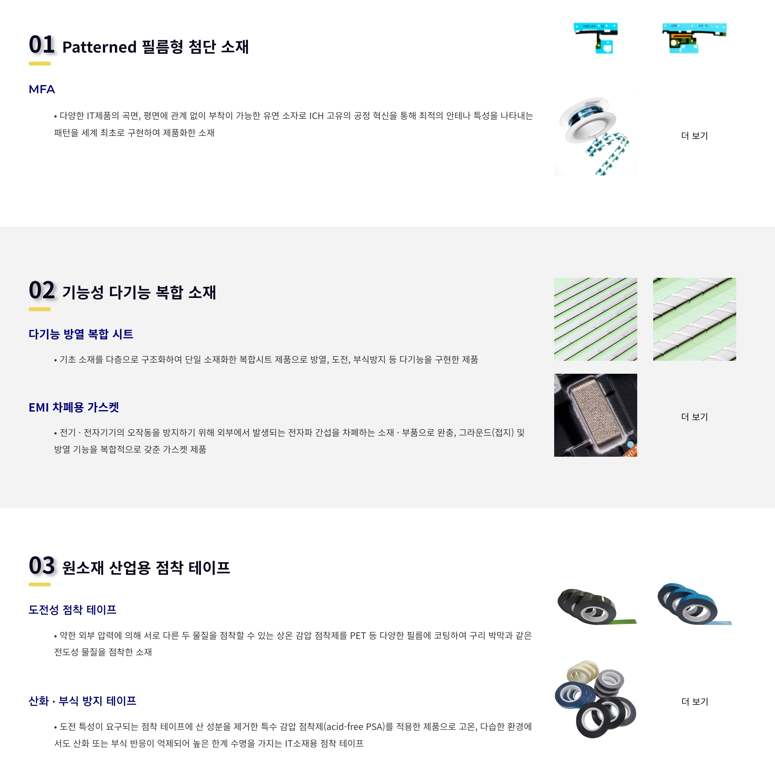 아이씨에이치의 제품은 기초소재 제품군, 복합소재 제품군, 첨단소재 제품군으로 구분할 수 있습니다. 기초소재 제품군에는 도전성 및 부식 방지 테이프 제품이 속한 IT 소재용 점착 테이프 등이 포함되고, 복합소재 제품군에는 전자파(EMI) 차폐 가스켓 및 다기능 방열 복합시트 등의 제품이 포함됩니다. 첨단소재 제품군에는 스마트기기 및 네트워크용 안테나 등 필름형 회로 소재 사업으로 구성되어 있습니다.