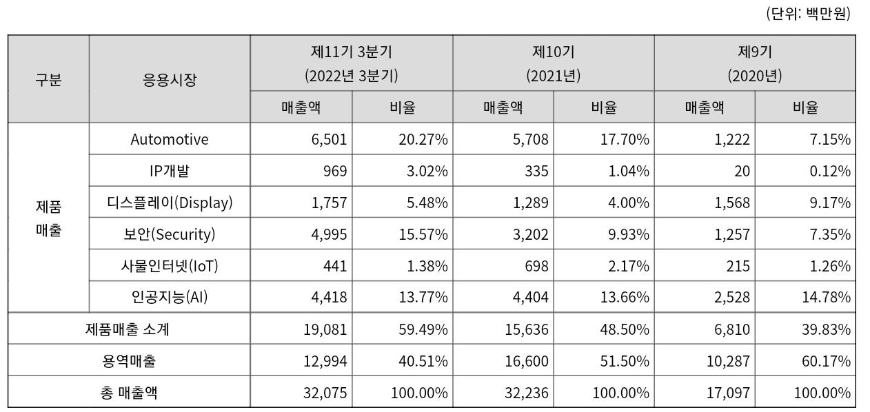 각각의 매출이 전체 매출에서 차지하는 비중은 위의 사업보고서에 표기된 것과 같으며 Automotive(자동차)용 반도체향 매출이 매년 증가하는 것이 주목할만한 부분입니다.