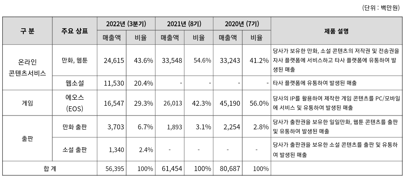 미스터블루의 매출에서 가장 큰 비중을 차지하는 것은 만화, 웹툽 그리고 웹소설입니다. 2022년 3분기 까지 거의 2021년 한해 매출과 비슷한 수준의 매출을 기록했습니다.