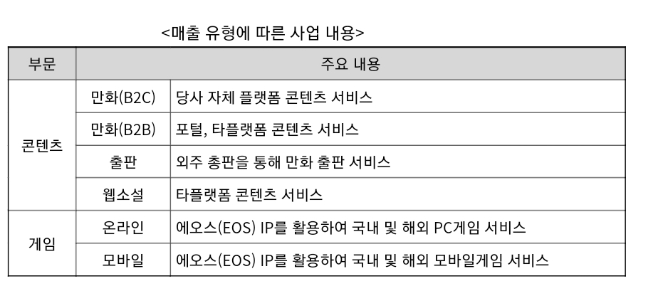 미스터블루는 만화, 소설 콘텐츠를 전자책(e-Book)으로 변환하여 PC 또는 모바일 디바이스를 통해 이용할 수 있도록 서비스하는 온라인 만화 콘텐츠 사업과 웹소설 사업, 만화 콘텐츠를 도서로 출판하여 판매하는 만화 출판사업, 게임 소프트웨어를 개발하여 PC를 통해 서비스하는 온라인게임 사업을 영위하고 있습니다. 이를 통해 온라인 만화 콘텐츠 매출, 만화 출판 매출, PC게임 매출, 모바일게임 매출이 발생하고 있습니다.