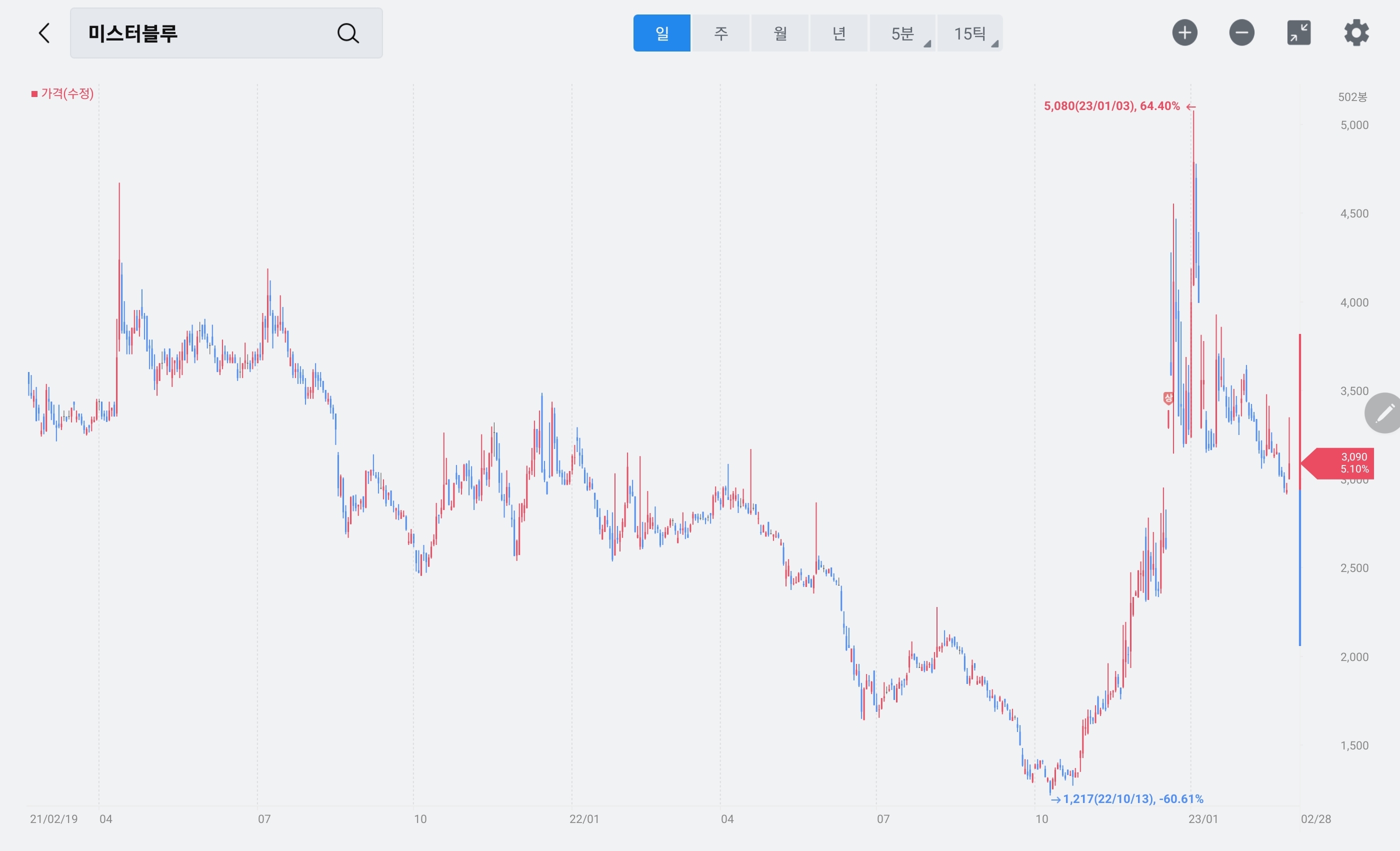 최근 AI로 웹툰 불법 유통이 근절될 가능성이 높다는 뉴스나 재벌집 막내아들 이슈(미스터블루 플랫폼에서 재벌집 막내아들 웹소설 보기 서비스 제공 중)로 주가가 크게 올랐으며 이러한 급등이 잠잠해진 후에 또다른 차기작에 대한 기대감이 다시 커질 때쯤 매수를 들어가는 것이 좋을 것으로 판단됩니다.