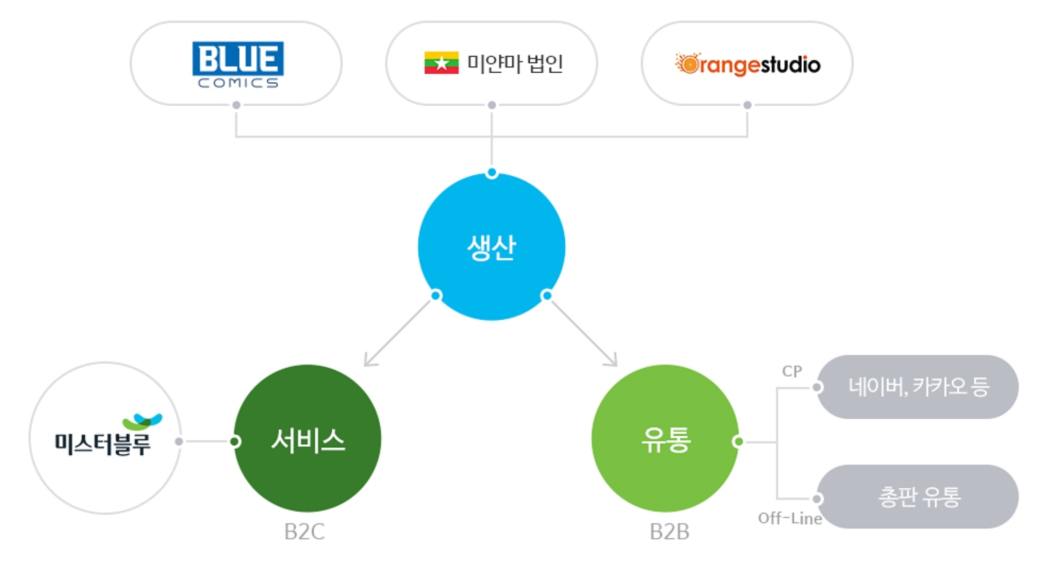 미스터블루는 만화/웹툰 콘텐츠의 생산 → 유통 → 서비스라는 일관시스템을 구축한 만화전문 기업입니다. 주요 만화가의 저작권(IP)을 취득해 킬러 콘텐츠를 전자책(E-BOOK)으로 만들어 미스터블루 사이트(mrblue.com)를 통해 서비스하고 있으며, 콘텐츠 공급자(contents provider) 로써 네이버, 카카오, 원스토어 등의 포털사이트 및 기타 플랫폼에도 공급하고 있습니다.