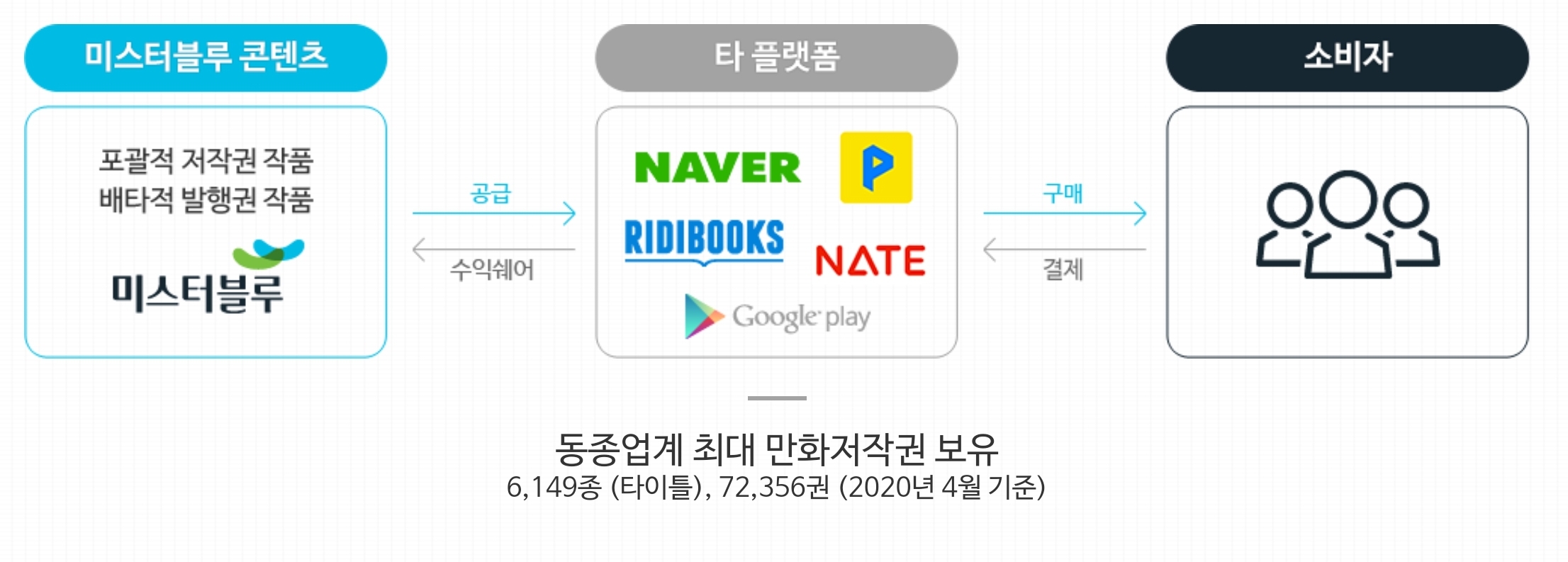 미스터블루가 저작권을 보유하고 있는 만화 콘텐츠를 네이버, 카카오, 네이트, 구글북스 등 20여 개의 포털과 플랫폼에 공급하고 그 대가로 매출의 일정부분을 수익쉐어(Share) 합니다.