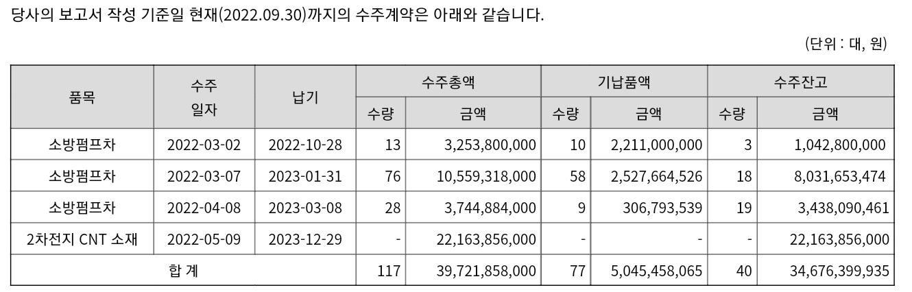 2022년 3분기까지 이엔플러스의 매출에서 절대 비중을 차지하는 것은 소방차 매출부문이며 2차전지 매출은 아직 발생하지 않았습니다. 다만, 2차전지 CNT소재 수주총액이 221억 있으며 앞으로 이 분야의 성장성이 기대됩니다.
