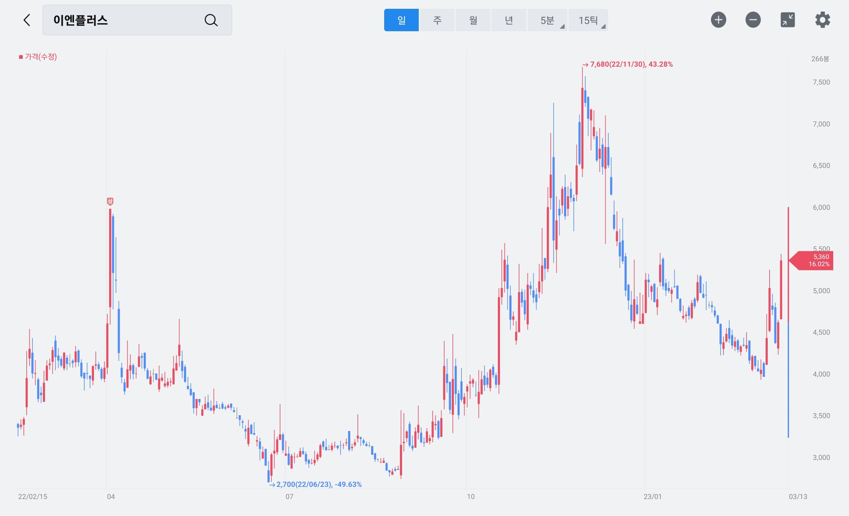 2023년 3월 13일 종가기준 이엔플러스의 시가총액은 3,127억입니다.