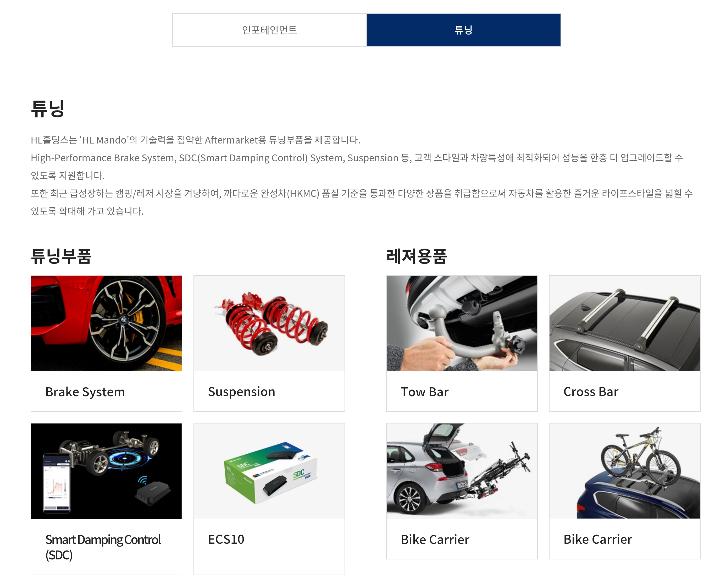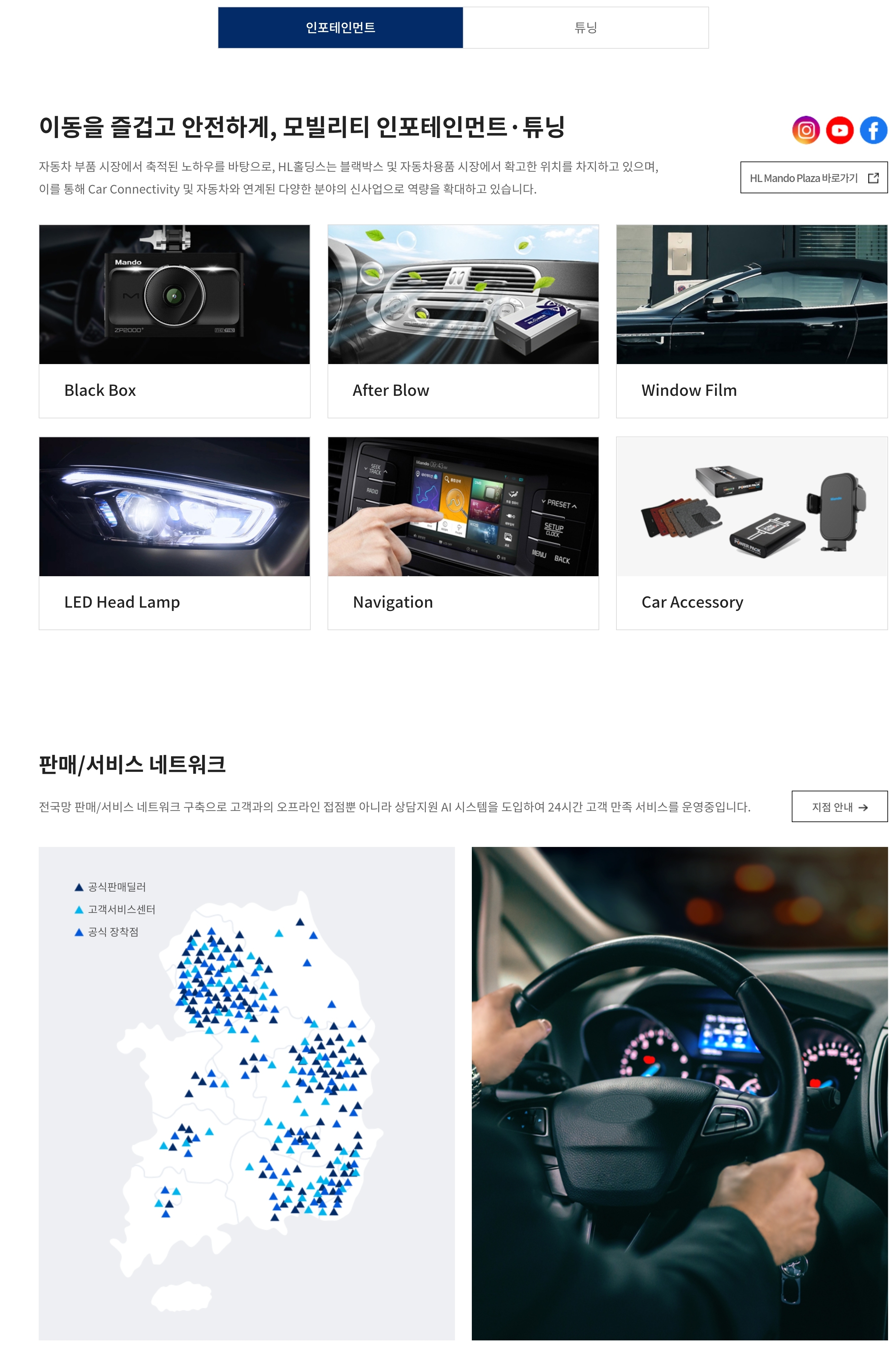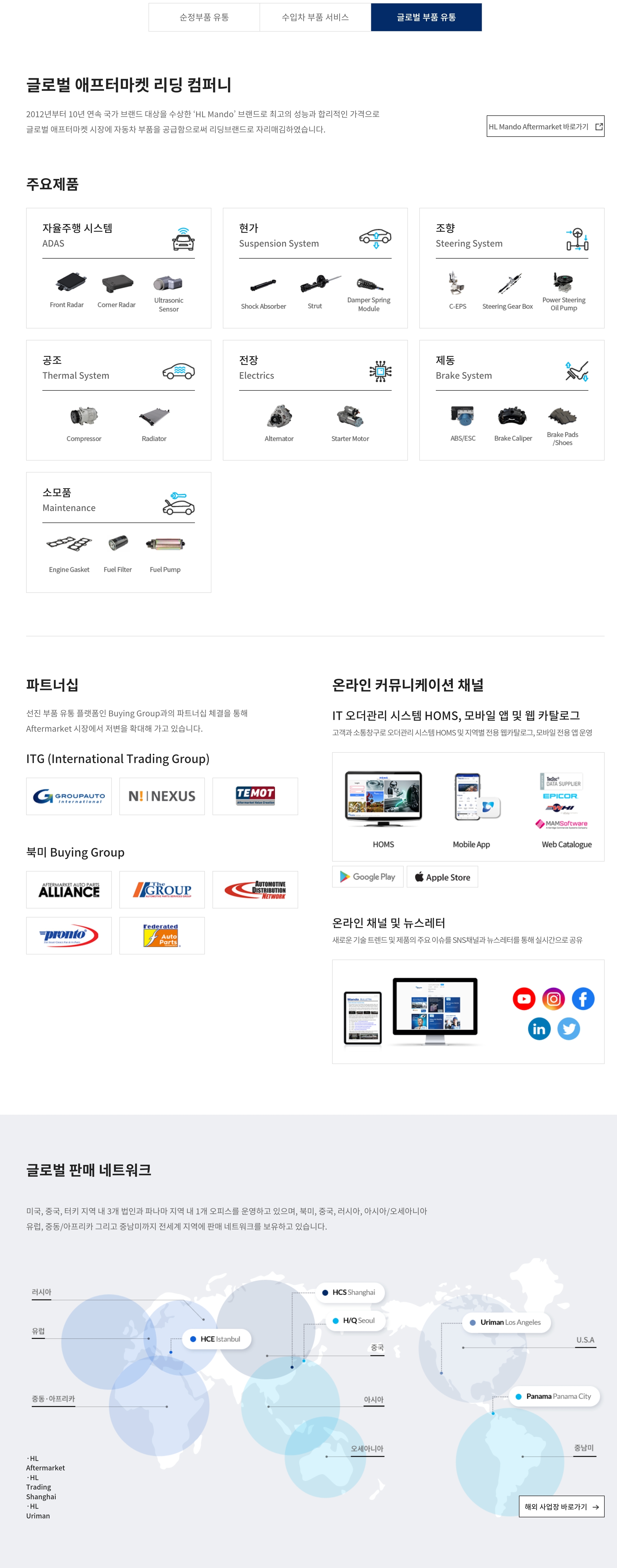 HL홀딩스는 강력한 글로벌 유통 네트워크와 글로벌 소싱 경쟁력을 확보하고, 조향, 현가, 제동, 공조는 물론 EV까지 다양한 아이템을 제공합니다. 국내 순정부품 유통, 수입차부품 서비스, 글로벌 애프터마켓 부품 유통 등을 하위 사업으로 하고 있습니다. 또한 2012년부터 10년 연속 국가 브랜드 대상을 수상한 ‘HL Mando’브랜드로 전세계 각지에 애프터마켓 부품을 제공하고 있습니다.