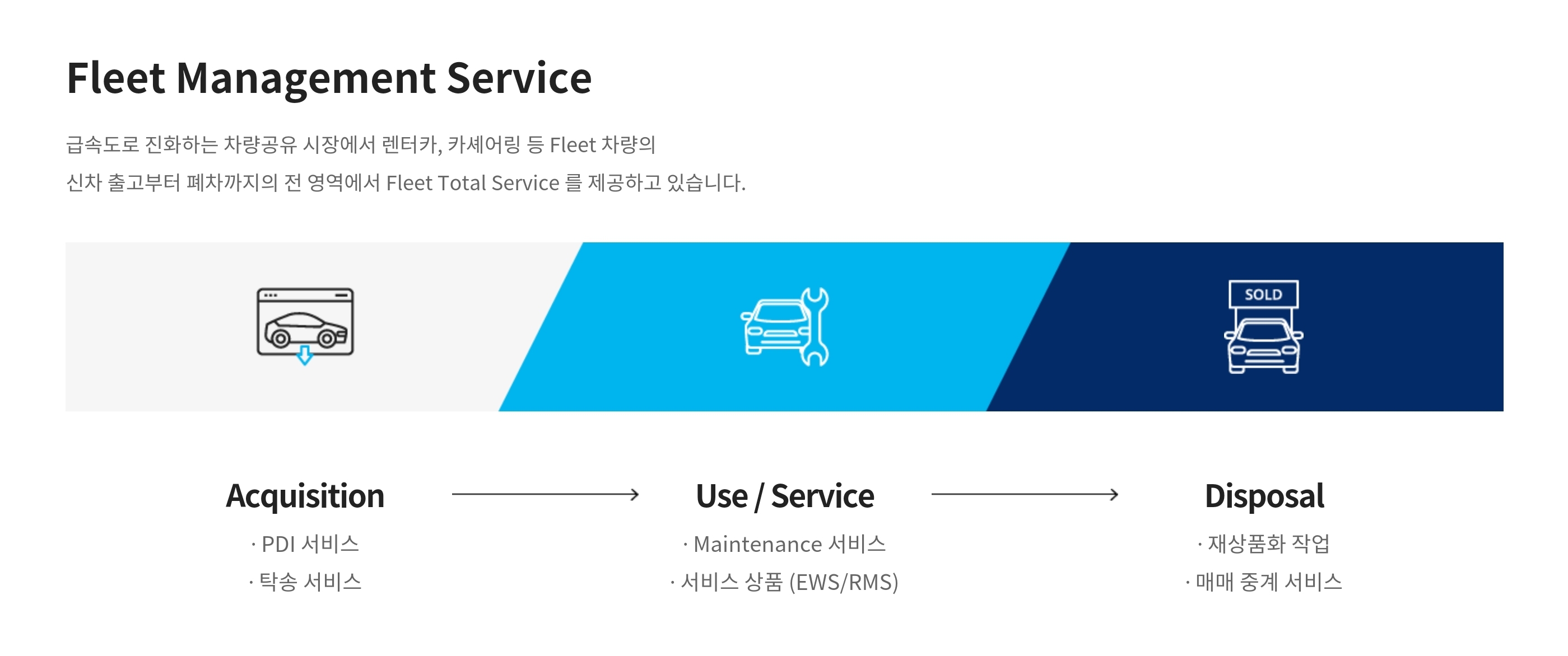 급속도로 진화하는 차량공유 시장에서 렌터카, 카셰어링 등 Fleet 차량의 신차 출고부터 폐차까지의 전 영역에서 Fleet Total Service 를 제공하고 있습니다.