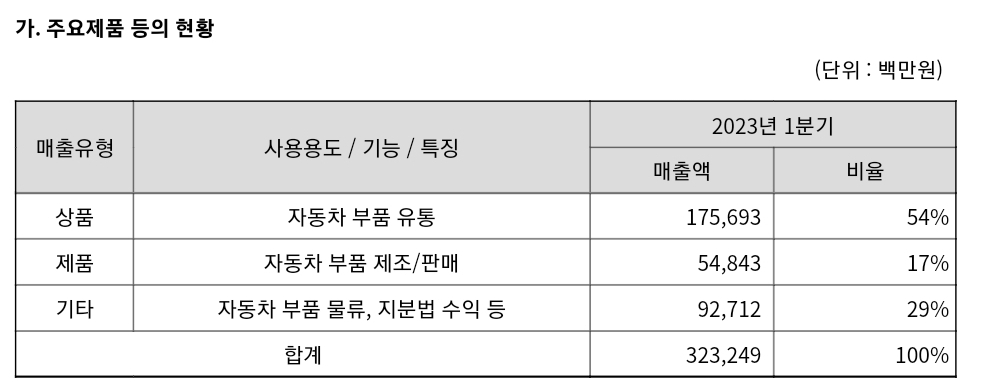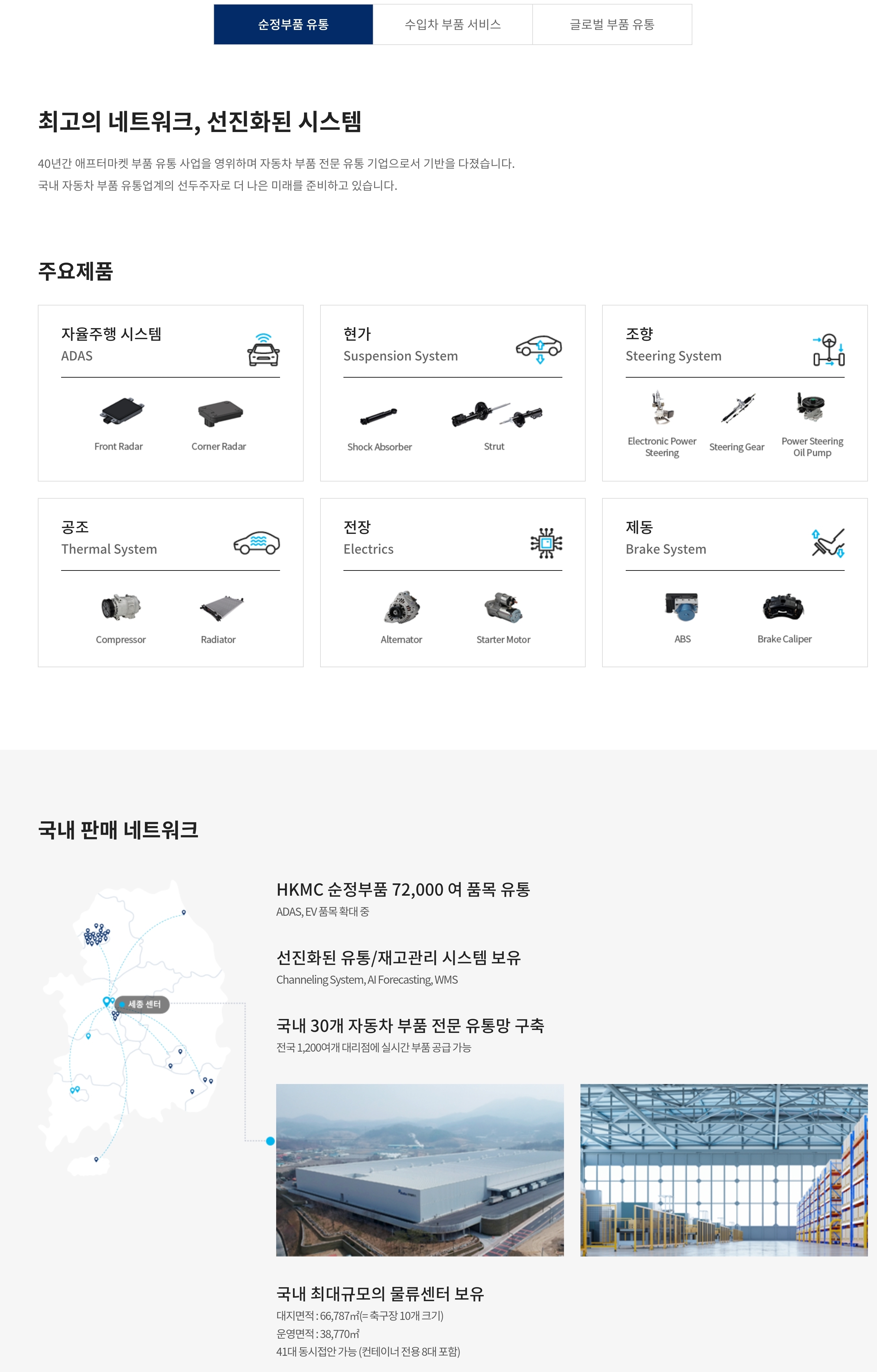 자동자 부품 유통에 관해서는 부품 제조업체와의 전략적 파트너쉽을 통하여 자동차 정비에 필요한 After Market용 순정부품(현가장치, 조향장치, 제동장치, 공조부품, 전장부품, 계기류, 모터류, 에어백 등)을 공급받아 전국 30여개의 유통 네트워크를 통하여 안정적으로 공급 판매하고 있습니다. 또한 자동차부품의 구매대행, 포장, 수입/통관, 조달, 검수/검품, 보관, 유통가공, 국내외 운송 등을 제공하고 있으며, 자동차부품 물류의 Total Service 노하우를 바탕으로 3PL 물류 및 고객 맞춤형 물류 컨설팅 Service를 제공하고 있습니다.