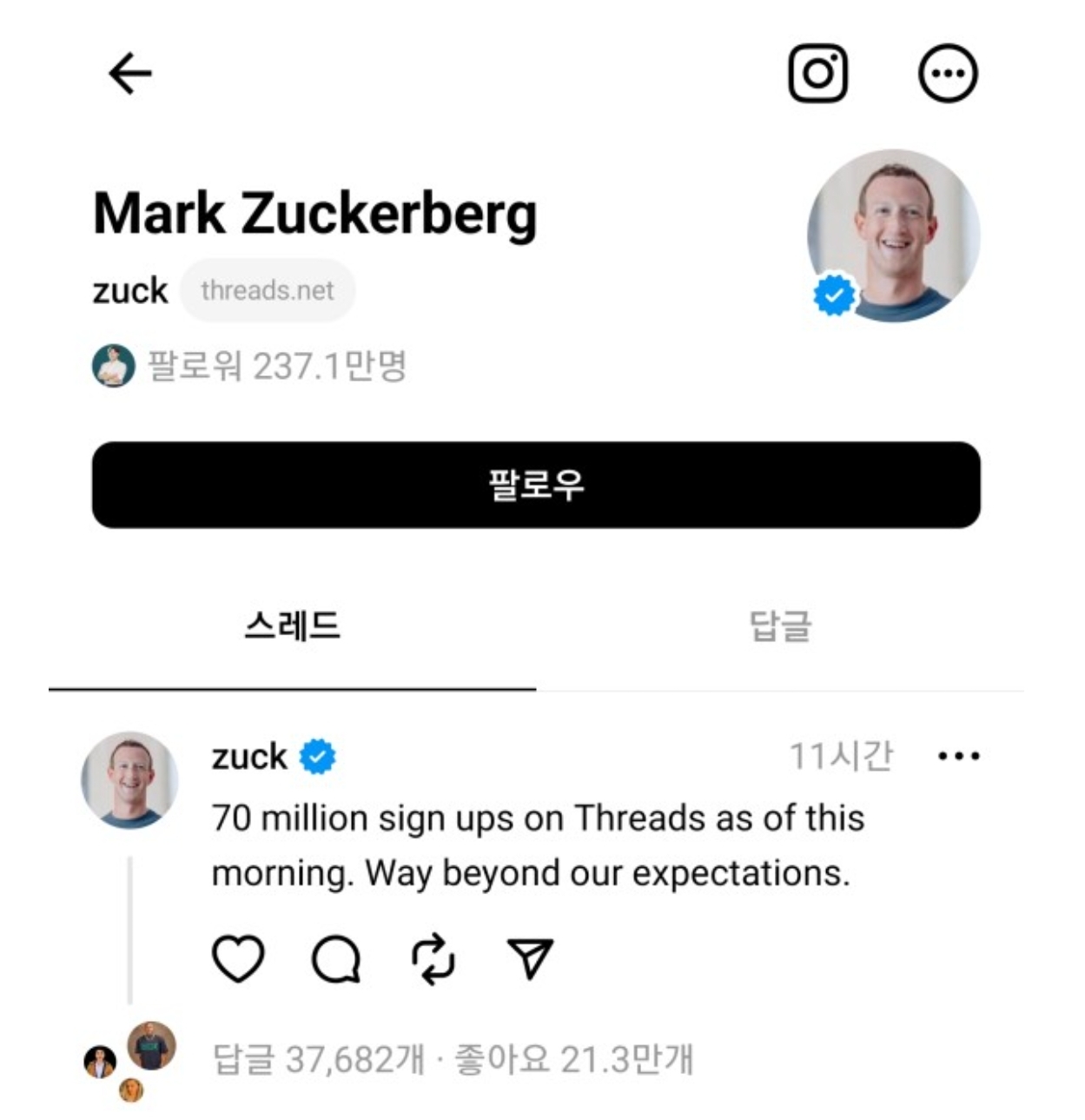 지난 7월 5일 메타는 트위터의 대항마로 자사 SNS플랫폼인 스레드(Threads)를 출시했습니다.