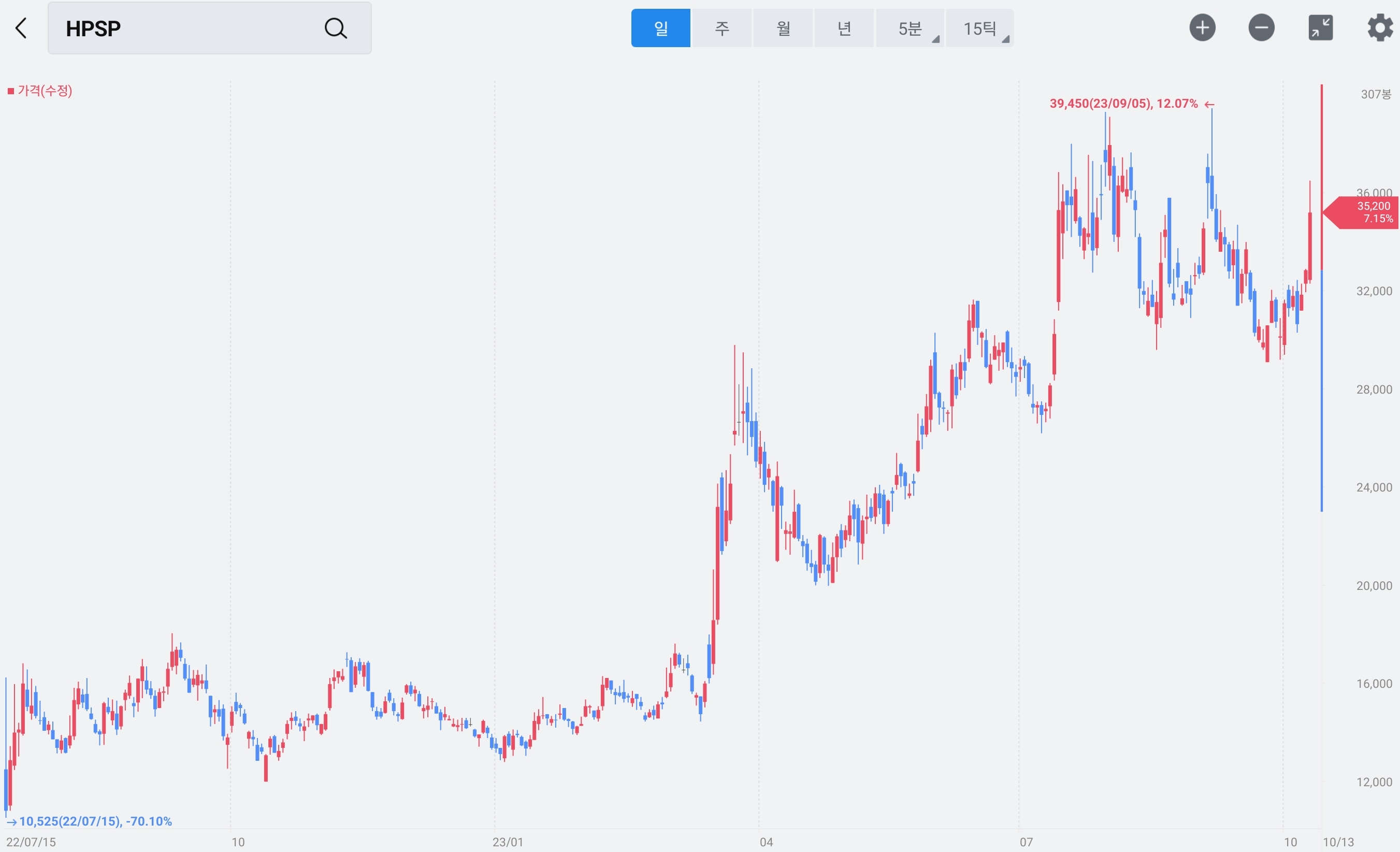 2022년 7월 15일 상장한 이후 지난 1년간 주가는 꾸준히 올라 2023년 10월 12일 종가 기준 HPSP의 시가총액은 2조 8500억 입니다.