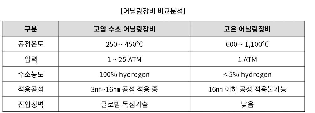 트랜지스터 막을 형성하는 High-K소재(HfO2, 하프늄옥사이드)는 28나노미터(이하 "㎚") 이하 공정에서 발생하는 터널링 현상으로 인한 누설전류를 막기위해 도입되었고, High-K 소재의 유전율은 기존 SiO2 비해 5배 이상 높으나 High-K 소재를 채택할 경우 "Interface Defect”발생 수준이 기존 SiO2 대비 100배 증가하여 전반적인 반도체performance를 제한시키게 되며, 이를 극복하기 위한 새로운 Solution이 고압에서 가스 농도를 높여 저온 공정을 가능하게 하는 것이 고압어닐링(High Pressure Annealing, 이하 "HPA")공정입니다. 고압어닐링 기술은 수소(H2)/중수소 (D2)를 이용한 화학 작용을 통해 Interface Defect에 H-Si (Hydrogen-Silicon) bonding을 형성하여 Interface Defect를 전기적으로 비활성화함으로서 구동전류 및 집적회로의 속도를 현저히 개선시킵니다.