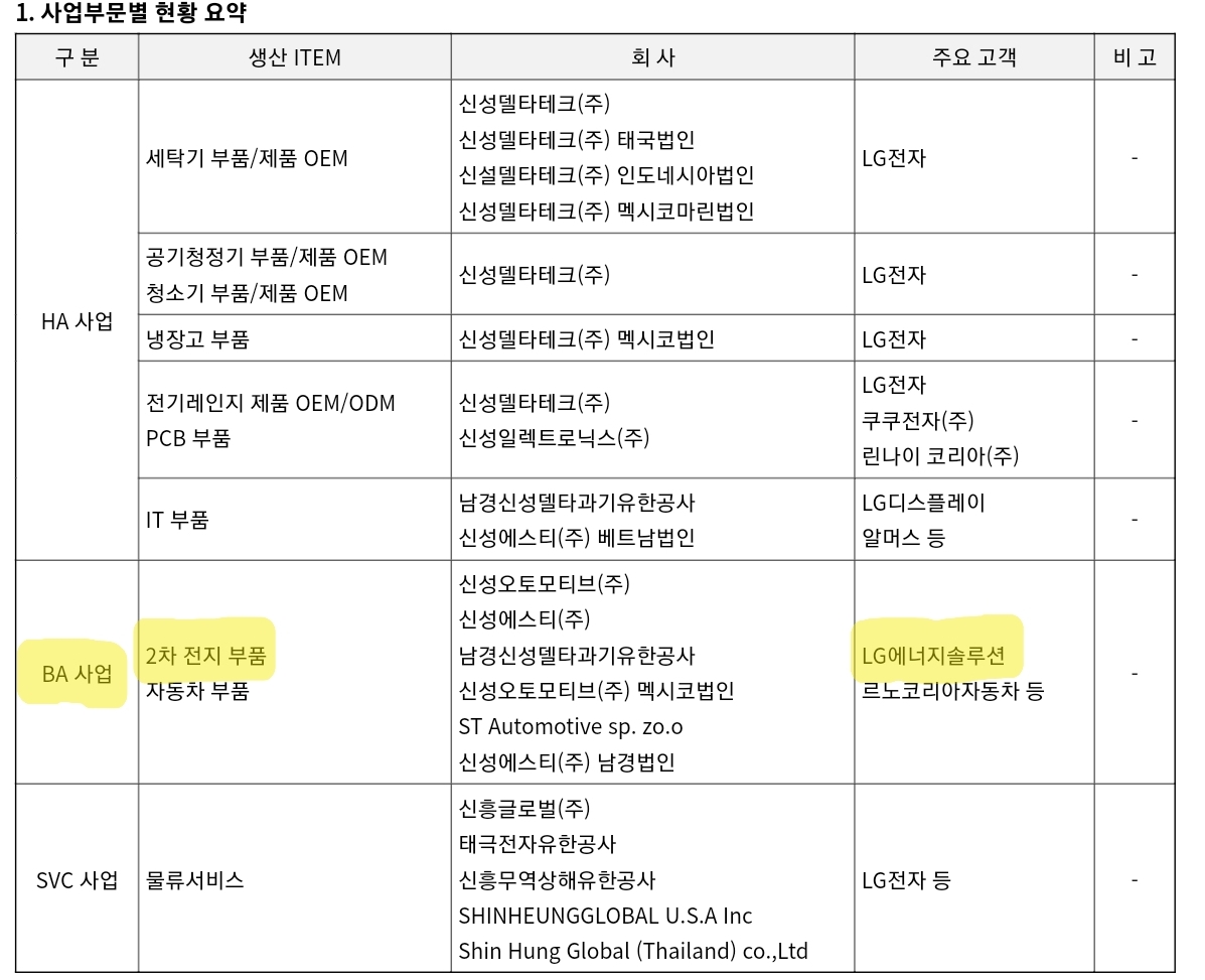 신성델타테크는 사업의 계속성 등을 고려하여 경영의 다각화 실태를 적절히 반영할 수 있도록 HA(생활가전), BA(2차전지), SVC(물류서비스) 3개의 사업부문으로 구분하고 있습니다.