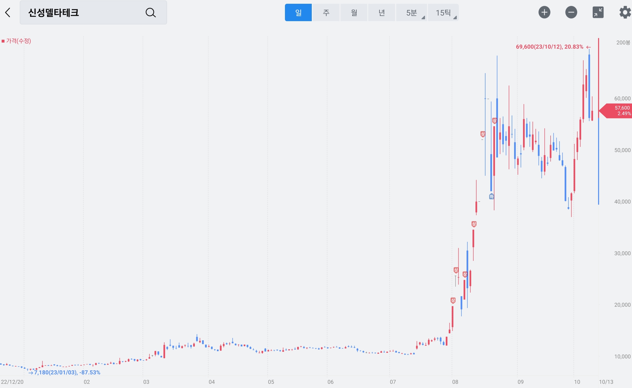 신성델타테크의 2023년 10월 12일 기준 시가총액은 1조 5천억에 육박합니다.
