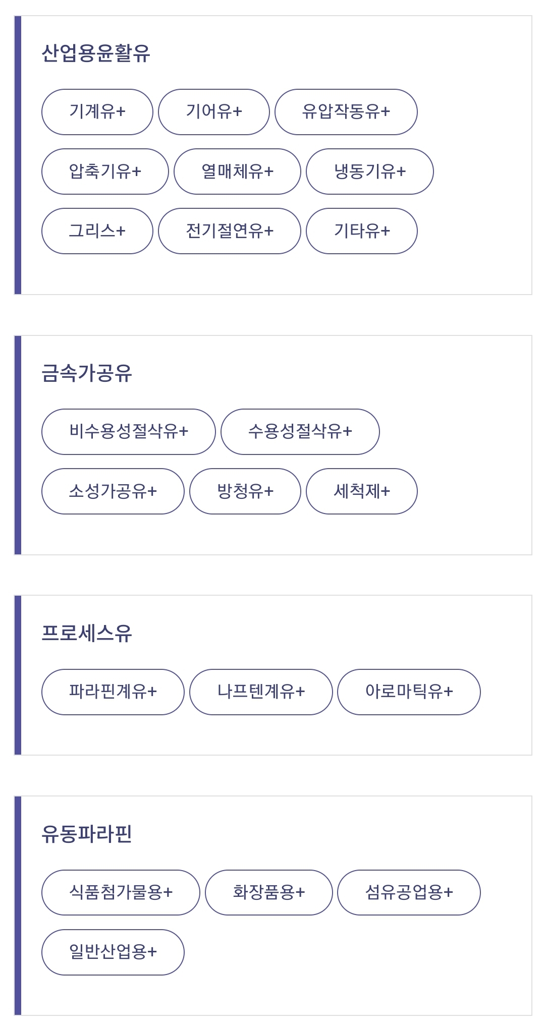 각종 고급윤활유를 생산, 공급하고 있으며 해외 특수유제품 (MATSUMURA OIL 등)을 수입, 공급하고 있습니다.