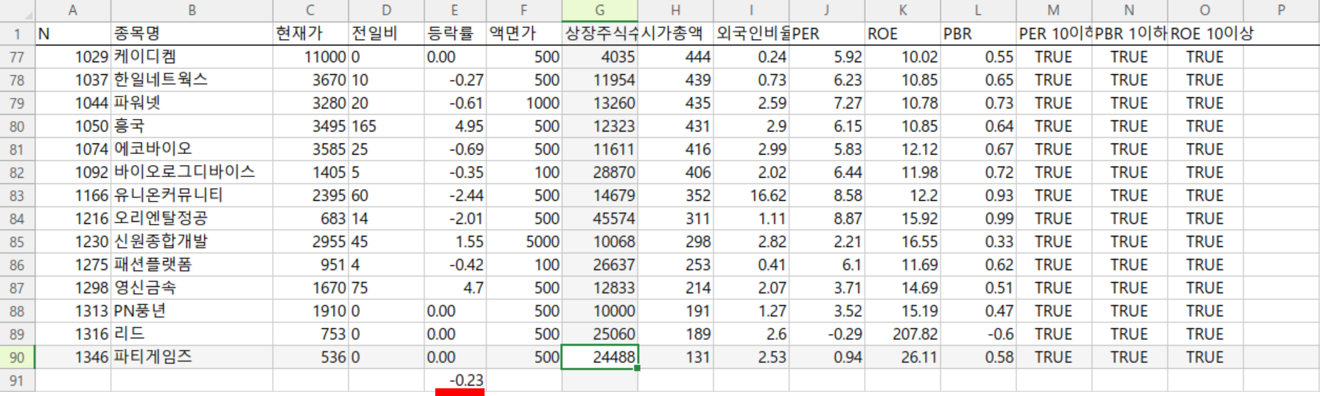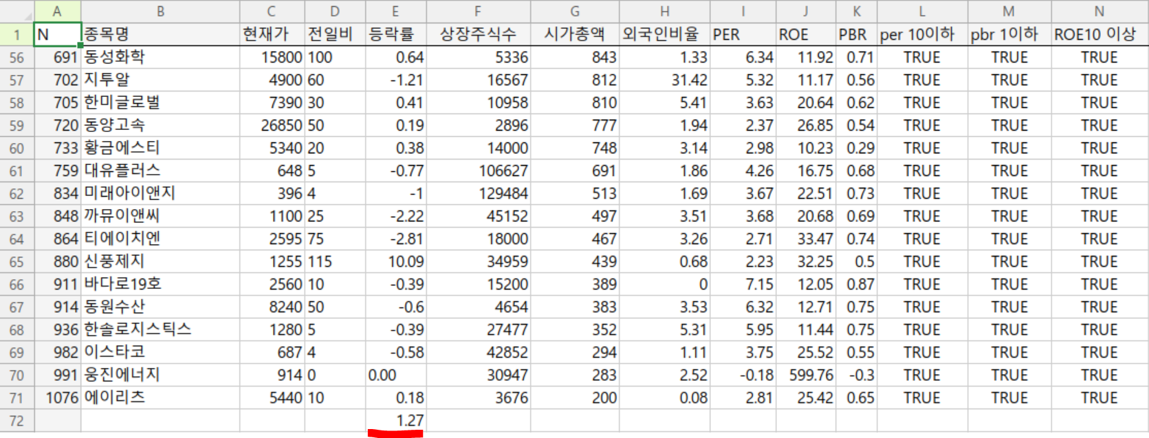 우선 코스피 코스닥의 전종목 리스트에서 PER 10이하 PBR 1이하 ROE10이상의 기업들을 필터로 거르고 4월 10일 기준으로 해당 기업들의 가격 변동폭과 코스피 코스닥 지수 변동폭을 비교하였습니다.