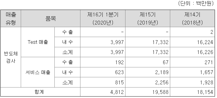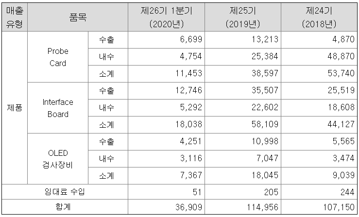 1) Probe Card: 전공정완료 시점의 웨이퍼를 TEST하는 장비 Nand Flash 검사용으로 SK 하이닉스 및 삼성전자에 공급 중, NAND FLASH의 수요가 매출에 가장 큰 영향을 줌, 주요부품을 내재화하고 있으며 이로 인한 납기, 품질, 원가경쟁력을 확보하고 있음, 수작업에 의존하던 제조 방식을 자동화하므로써 고품질의 제품을 짧은 시간안에 제조가능