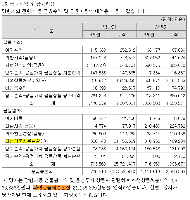 재무상태표에서 알수있다시피 알서포트의 영업수익은 거의 2배 가까이 증가했지만 당기순이익은 작년 반기기준 56억인데 비해 올해는 반기순손실 76억을 기록했습니다. 그 이유는 파생상품처분손실이 전반기 대비 200억 가까이 증가했기 때문입니다.