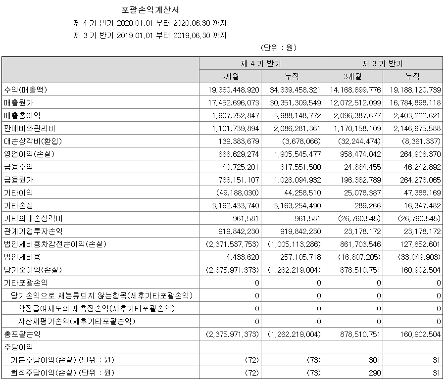 나인테크의 2020년 반기 매출은 2019년 동기대비 약 2배정도 성장하였으며 매출총이익도 동시에 성장했습니다. 이러한 매출 성장에 힘입어 영업이익은 작년 동기기준 2억에서 20억 가량으로 증가했습니다. 하지만 스펙합병과정에서 있었던 합병비용이 31억가량 발행함과 동시에 당기손익인식 금융부채에서 5억원 정도의 비용이 전년동기 대비 증가하면서 2020년 반기기준 순이익(순손실)은 전년동기 대비 오히려 감소한 -12억을 기록했습니다.